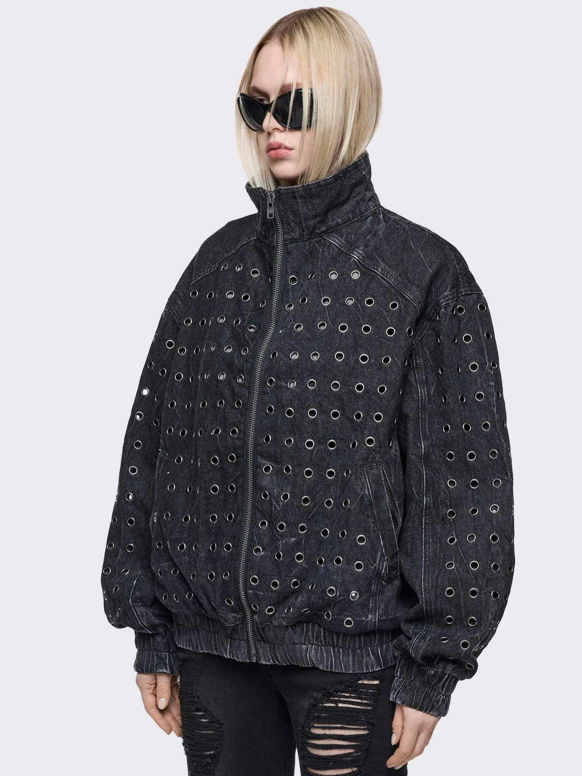 - Black washed denim bomber jacket